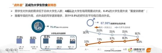 ● 调研发现,75.4%的大学生每月都会点外卖,每天点外卖的大学生已接近10%,这个比例虽然不高,但每天都点外卖这个前提下,再看点外卖的频繁度其实已经很高了。“点外卖”正在成为大学生饮食的新常态。