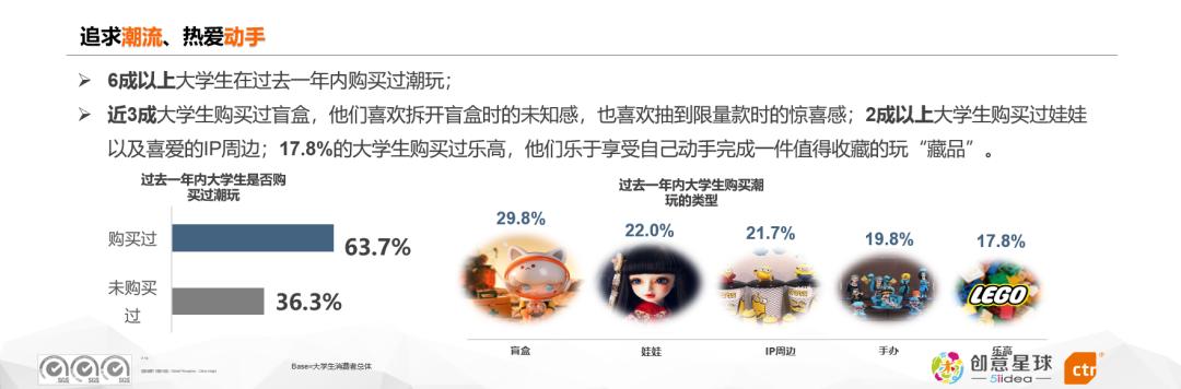 ● 大学生喜欢追求潮流,热爱动手。6成以上大学生在过去一年内购买过潮玩。近3成大学生购买过盲盒,他们喜欢拆开盲盒时的未知感,也喜欢抽到限量款时的惊喜感。