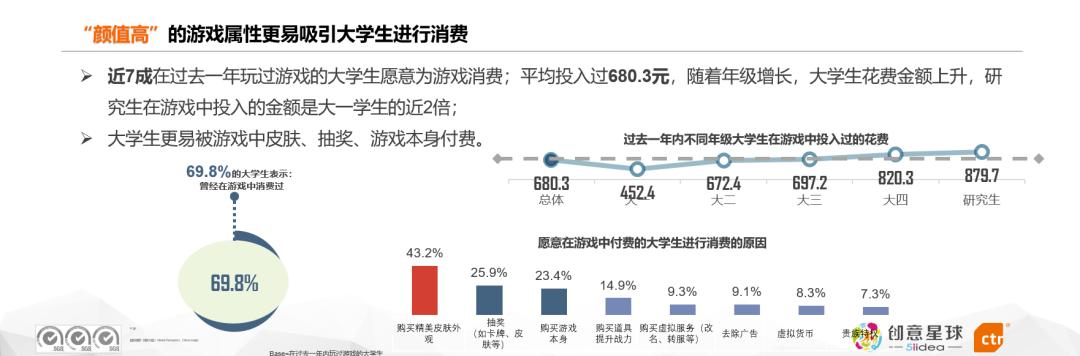 ● 在游戏上,大学生也是颜值控,颜值高的游戏更受大学生的青睐。近7成在过去一年玩过游戏的大学生愿意为游戏消费,平均投入过680.3元。