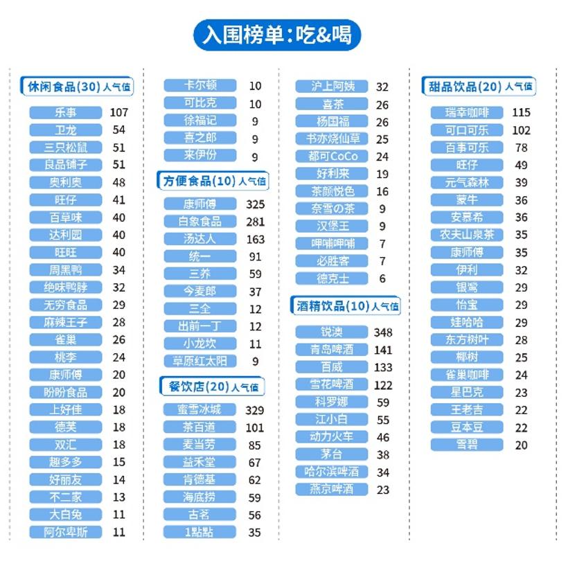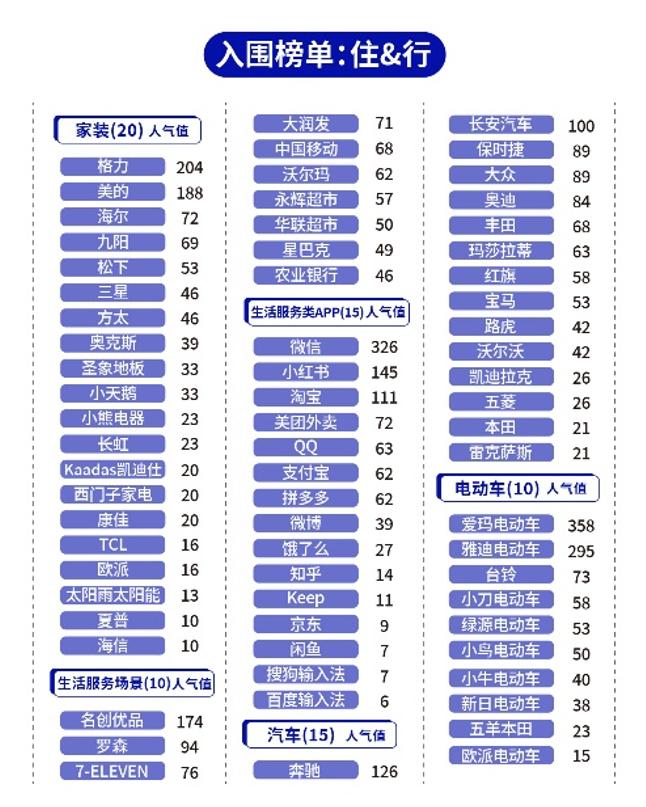 ● 本研究共分了两个阶段。第一阶段于6-8月开展,由4000+的在校大学生从衣食住行、吃喝玩乐等19个品类的1800个品牌中,评选出500个入围品牌,这个入围榜已于今年8月份在天津发布。