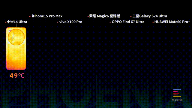 同时小米14 Ultra也是发热最严重的一款,背面最高温来到了49°C,还是那个为发烧而生的小米。然后是iPhone的46.8°C、vivo 45.2°C。其余四款机型的背面最高温都在42、43度左右。