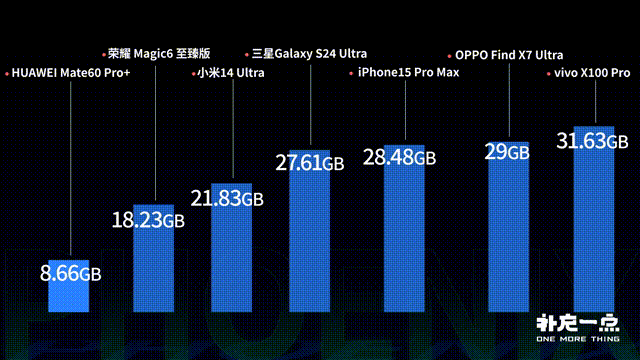 在最终的视频文件大小上,华为不知道用了什么先进的压缩算法,在画面质量跟其他几家没有明显差距的前提下,一个小时的4K视频文件只有8.66GB。荣耀以18.23GB的大小紧随其后。其他5款手机的文件大小都在27-30GB左右。综合下存储空间、续航以及发热表现来看,华为Mate60 Pro+是这一小时测试中表现最好的机型。