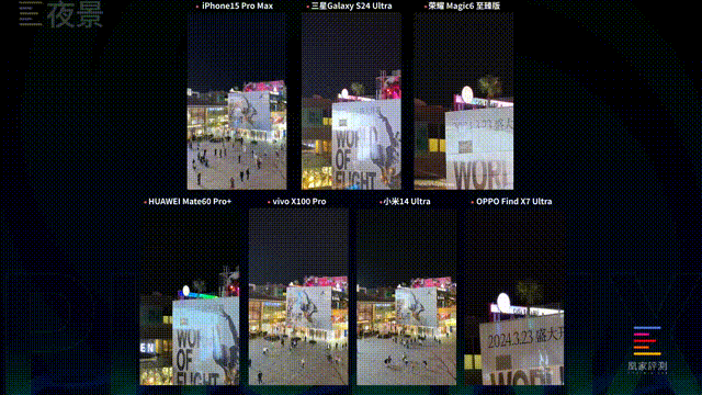 在白天光线充足的CBD社区,7款机型在1倍画面下的细节保留能力基本相当,打眼看上去不会有明显区别。但在色彩还原表现上,iPhone 15 Pro Max、三星S24 Ultra、OPPO Find X7 Ultra以及vivo X100 Pro要做的更好一些,华为Mate60 Pro+整体的颜色有些偏绿,小米14 Ultra跟荣耀Magic6 至臻版的白平衡有明显偏差,灰色水泥地面已经变成了蓝色。