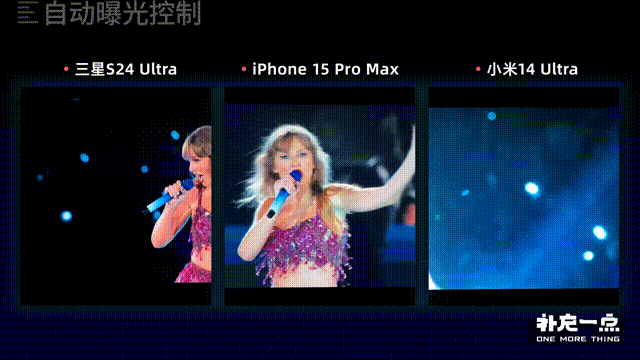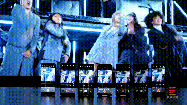 在最后的曝光跟色彩控制上,我们用一个miniLED电视在午夜的办公室里播放HDR的演唱会内容,来模拟大家在演唱会这种光线复杂的现场进行录制。七款旗舰机在这一部分出现了相对明显的差距。三星、iPhone跟小米的整体表现处于第一梯队,三者对于演唱会这种灯光变化复杂的场景都有很不错的曝光以及白平衡控制。小米在画面上刻意压低了一些暗部来让画面更纯净,但也因此丢掉了一些细节;iPhone则是在纯黑或者大面积黑色的场景下会自动提亮暗部,画面显得有点脏,需要手动压一下;三星相对比较均匀,不会有过亮或者过暗的情况。