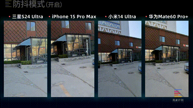 接下来我们打开各家的防抖模式。不过因为荣耀Magic6 至臻版没有提供单独的防抖按钮,这次测试依旧为4K@60fps画面录制,我们就不做对比了。其余六款机型打开防抖后都会有不同程度的画面裁切 以及 帧率限制。iPhone打开运动模式后可以提供2.8K@60fps的画面,三星是1440p@60fps,华为、OPPO、vivo是1080p@60fsp,小米则是1080p@30fps。