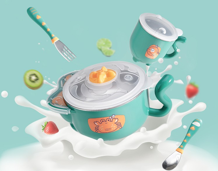宝宝的注水碗一定要有一套,等娃饭量大了及天冷的时候,饭易量就需要这种控温的设计了,Babycare配套的刀叉带脚好搁放,给宝宝刮果泥的时候最常用的就是这里的不锈钢勺。