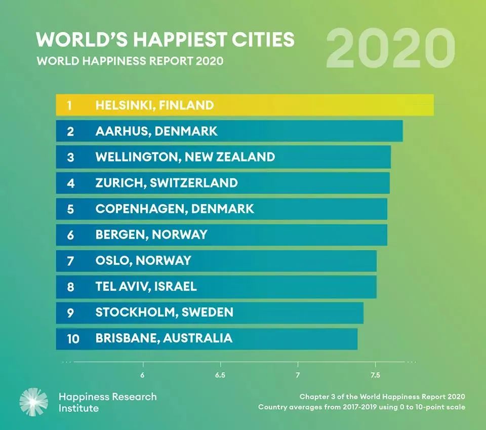 ▲《2020世界幸福指数报告》“世界幸福城市”排行榜显示,芬兰首都赫尔辛基TOP1,丹麦主要城市奥胡斯TOP2和首都哥本哈根TOP5。 Photo:The Happiness Research Institute