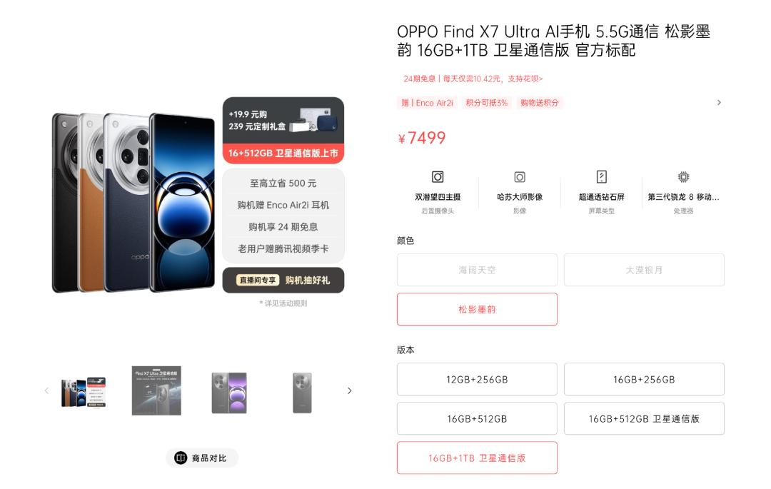 OPPO 在今年年初发布的旗舰 Find X7 Ultra 上,在硬件配置上选择将 1TB 内存版本绑定“卫星通讯”这个相对高附加值的技术作为主要卖点,通过差异化的功能点分担存储成本上涨带来的直接成本冲击。
