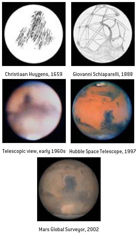 19世纪中叶,天文学家们发现火星与地球存在许多相似之处,如公转轨道与地球相近,自转速度与自转轴倾角也与地球几乎相同。1877年,意大利人斯基亚帕雷利在观察火星时发现火星表面布满了极细的直线构成的网状系统。按照传统,这些暗区被视为水体,这些细线也被命名为“水道”(canali)。