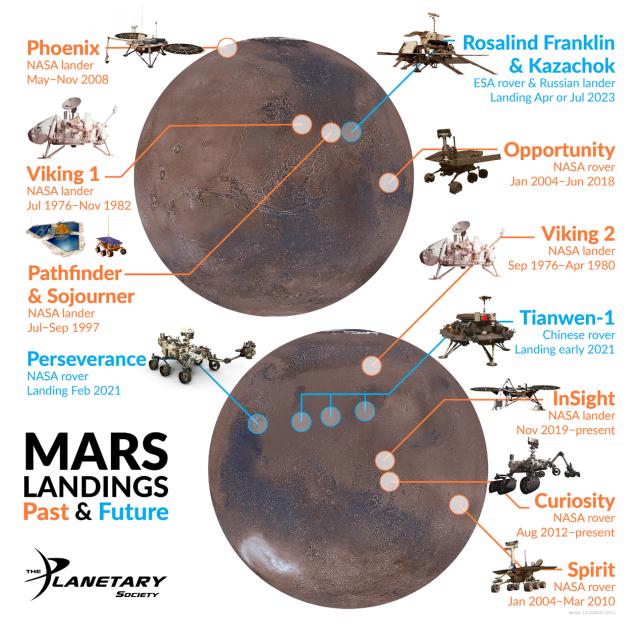 苏联先后发射的“火星”系列探测器多以失败告终。其中火星-3着陆舱实现了在火星表面的软着陆,虽然仅仅发送了20秒的电视信号,但这是第一个到达火星表面的探测器。火星-5探测器成功进入火星轨道并发回了火星照片。随后,苏联先后发送了探测器-2和宇宙-419探测器,都未取得成功。