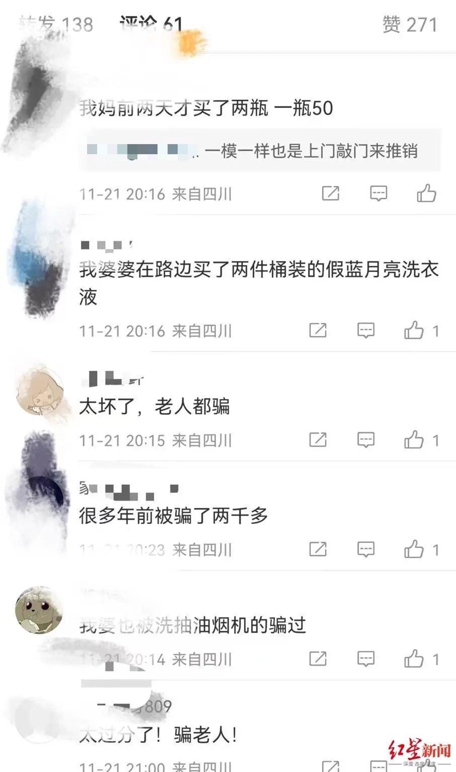 事实上,曾先生母亲的遭遇并不是个例。曾先生在网上讲述了自家遭遇后,引起了不少网友的共鸣:“很多年前被骗了两千多”“我婆也被洗抽油烟机的骗过”“我妈前两天才买了两瓶,一模一样,也是上门来推销。”