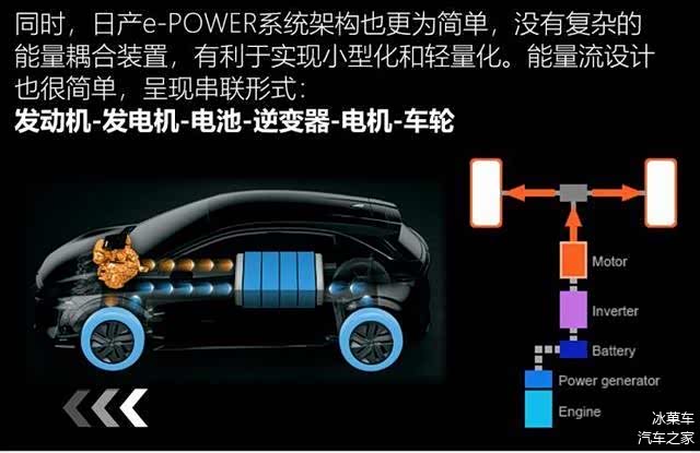 日产e-POWER系统是一种串联型的混合动力系统,它通过一个简单的传输装置将发动机、一个发电机/启停器和一个驱动电机连接起来,实现了燃油动力和电能的串联驱动。e-POWER系统只有一种模式,就是全时电驱模式。在这种模式下,发动机完全不参与驱动车辆,只是作为一台高效率的发电机来产生电能。所有的驱动力都来自于电池和驱动电机。因此e-POWER系统的驾驶感受完全等同于纯电动汽车,但由于的电能来自于燃油发动机而不是充电桩,所以e-POWER系统完全没有里程焦虑。