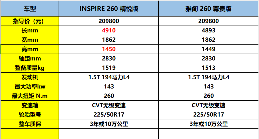 两台车的参数几乎一模一样,只不过INSPIRE的车身长那么一丢丢,几乎可以忽略不计,包括车身内部的空间几乎也没有区别。二者均采用目前本田的第二代1.5T VTEC 发动机,与本田自然吸气发动机不同的是,因为进气有涡轮增压进行辅助,所以这款发动机只添加了排气门的可变升程技术,所以并不像有些人说的本田的1.5T是阉割版的i-VTEC,只是感觉发动机型号前边少了一个字母i就被说成阉割版,而其实大家根本没必要对于到底是VETC还是i-VTEC纠结,只要把它当做一个代号就好,因为本田也只是把它当做一个技术理念了。比如冠道的2.0T的K20C3发动机进排气门都可变,但本田也是叫它VTEC,而不叫i-VTEC。