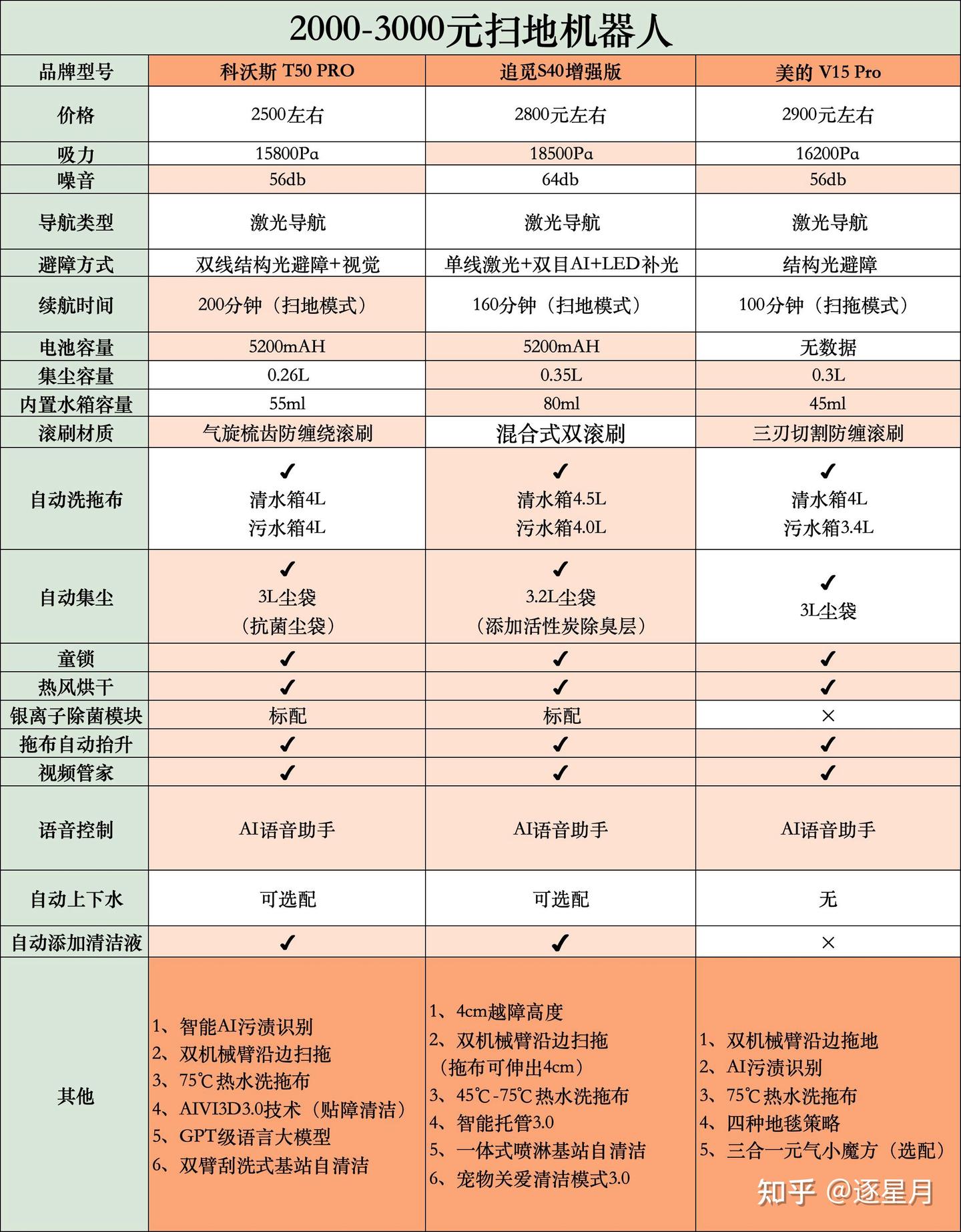 (1)科沃斯 T50 PRO【2500元左右】科沃斯T50 PRO的机身升级为81mm纤薄机身,吸力升级到了15800Pa超大吸力,扫吸更加彻底,单次扫地丝毫没有遗漏的情况出现。这次不仅拖布支持外扩,边刷也支持外扩,能实现边角100%覆盖,墙边死角都能清扫到。带有智能 AI污渍识别,能自动匹配清洁策略,调节清洁参数以及次数,不需要自己手动多次操作。滚刷配置采用气旋梳齿防缠绕滚刷,扫、梳、吸,一遍吸附毛发,不缠绕。避障上采用Mini多维视觉模组,雷达+双线结构光+视觉,对低矮障碍物识别能力很不错。更有升级AINA3.0技术,清扫过程中能实时动态规划路线,做到贴障清洁。配置75℃热水洗拖布,相比冷水,油性的脏污在热水中溶解效果更加迅速,洗的也更加干净。同时升级了15mm高度自动抬升拖布,适合短毛地毯的家庭。尤其是自带YIKO-GPT自研大语言模型,突破固定语句操控,换个说话方式也能识别,交互性更好,更聪明。全链路抗菌设计,标配银离子模块水路抗菌+自动添加除菌液功能,在尘袋和滤网上都用了抗菌材质,能有效除菌除味。如果你注重比较墙边死角处和低矮区域的扫拖清洁效果,可以选科沃斯 T50 PRO,动态避障很灵敏、扫拖能力优秀。https://xg.zhihu.com/plugin/ba0810d9752447395684e3067166aea2?BIZ=ECOMMERCE(2)追觅S40增强版【2800元左右】避障导航搭载LDS激光导航、LDS+单线激光+双目AI+LED补光,可以精准识别避140+家庭常见障碍物,对于小物件都能很好的识别。S40增强版吸力最高可达18500Pa,滚刷设计采用了混合式双滚刷,在防缠绕能力上提升了不少,尤其是应对一些清洁短毛场景,维护更轻松。像地毯、地面缝隙都适用。自带仿生扫拖双机械臂,边刷和拖布都支持外扩,低矮区域清洁到位。并且在扫拖过程边刷、滚刷、拖布自由升降能实现真正干湿分离。基站内置一体式喷淋基站自清洁,不仅拖布洗的更干净,而且基站底部的不会残留污渍,便于清洁打理。智能托管3.0,最高75℃热水洗拖布加上银离子除菌可以更好的溶解污渍抑制细菌,避免拖布有异味。做到自动识别脏污,匹配相应的清洁次数,使用上很省心。全链路除菌抗菌配置,有娃家庭也能放心玩耍。还有宠物关爱清洁模式3.0,可智能识别粪便、宠物粮、尿垫,自动重点清扫易脏的宠物用品周边,同时可以对宠物进行抓拍、一键寻宠。在越障方面,升级全地形五轮越障,最高可以越过3cm+的门槛、台阶。此外,S40增强版还新增了HEAP自清洁和毛发尘盒压缩功能,细节功能更多。综合扫拖表现值得点赞,同时拖布支持外扩拖地,家里墙边卫生都能拖到位。对于适合有一定越障需求、对滚刷防缠效果要求更高的朋友。https://xg.zhihu.com/plugin/d5ffe16dd294813e3495ab4d37e125f7?BIZ=ECOMMERCE(3)美的 灵眸V15 Pro【2900元左右】搭载AI结构光避障+LDS激光导航以及升级自主脱困算法,脱困能力强。能识别障碍物的3D轮廓,实现精准避障150+常见物体。16200Pa大吸力搭配三刃切割防缠滚刷,往复4mm震动切割,可以很好应对长发、宠物毛发,防缠效果有所提升。扫拖双机械臂配置,自动识别边角,拖布和滚刷都支持外扩,拖地过程中向地面施加7N的压力,并且AI污渍识在扫拖模式下能灵活避开有色液体污渍。支持四种地毯模式,可以根据清洁环境进行选择。基站风车式刮洗自清洁加上75°热风烘干的功能,洗的干净的同时不用担心拖布潮湿有异味。还有三合一元气小魔方配件可选购,主要有除菌、净味、清洁的作用。自带AI语音助手、视频管家功能,这款美的灵眸V15 Pro表现各方面都比较均衡,避障能力不错,能够主动避障宠物,没有明显短板。有365天以换代修服务,性价比高。对拖地有更高要求的朋友冲一波。https://xg.zhihu.com/plugin/42a2a793c8d9de94573d4e26360e0812?BIZ=ECOMMERCE3、3000元-4000元