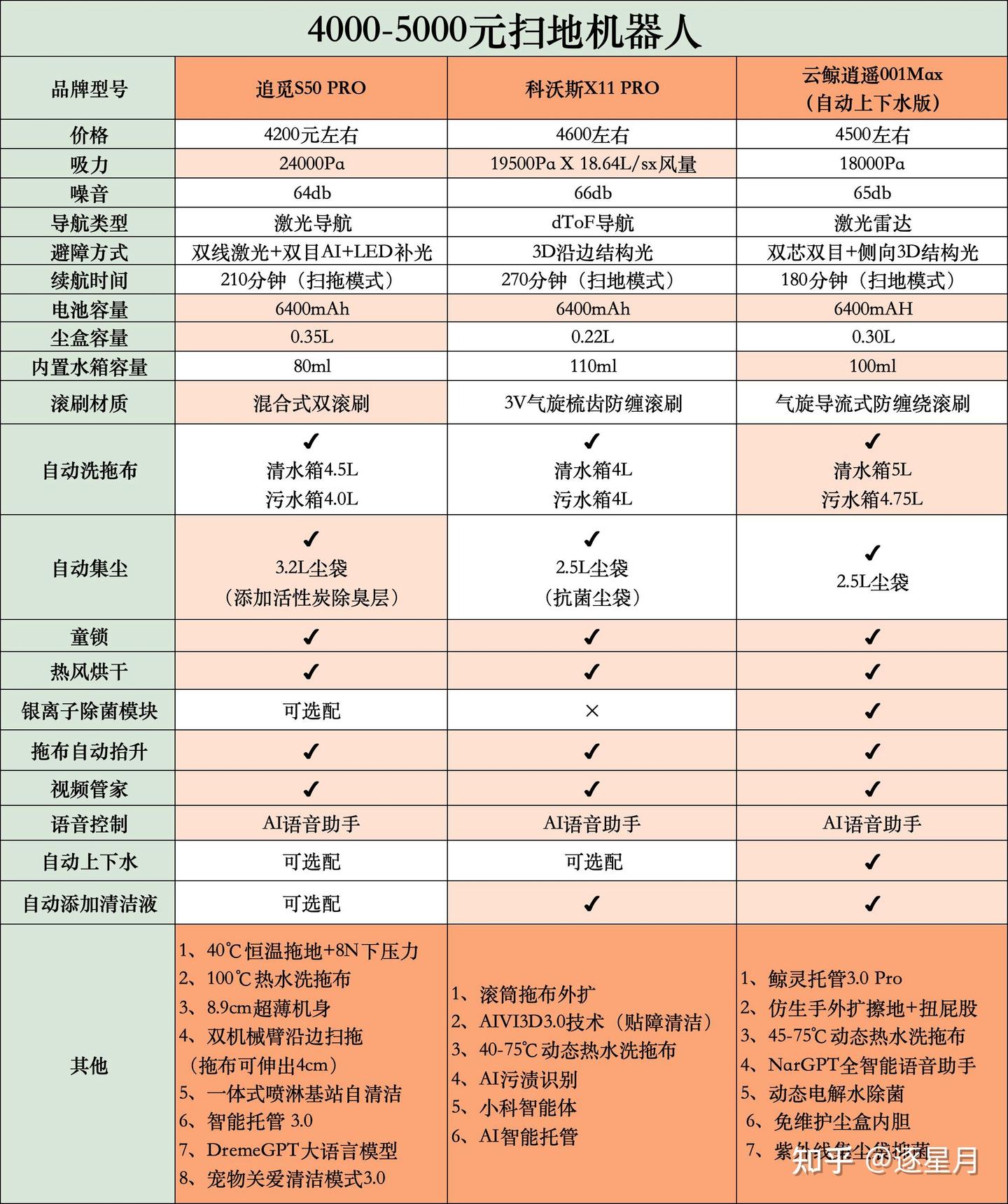 避障采用RGB视觉+线激光+下沉嵌入式雷达组合,不仅算法能力提升而且大大提升了避障灵敏度。不同于以往机型的普通风机,科沃斯X11 PRO采用的是BLAST飓风吸尘技术,其18.64升/秒的大风量+19500Pa的大吸力,地毯除尘率是普通扫地机器人的2.4倍。3V气旋梳齿防缠滚刷搭配风刀防缠边刷,防缠效果有所提升。自带了AI双感识别,支持三重智驱升降,也就是边刷、滚刷、滚筒都支持升降。 还有配备AI污渍识别2.0功能,每当识别到不同场景,能针对固液态污渍采取智能AI策略清洁,省心省力。水箱板基站配有双仓自动添加清洁液功能,热风烘干温度提升到了63℃。单次越障支持2.4cm,连续越障可以达到4cm,家里有小门槛和滑轨能放心使用。续航上除了内置大容量电池,还搭载瞬时超充补电功能,适合大户型家庭。(单次可清洁1000㎡)总的来说,科沃斯X11 PRO各项配置属于旗舰顶配机型,既保持了洗地功能强大的优势,智能性表现也很不错。适合预算充裕且对地面扫拖有高要求的朋友入手。https://xg.zhihu.com/plugin/7455968d424f4a107968b33123d36f2e?BIZ=ECOMMERCE(3)云鲸逍遥001Max 上下水版【4500元左右】逍遥001 Max是云鲸的高端款机型,这次的功能配置确实提升了不少。