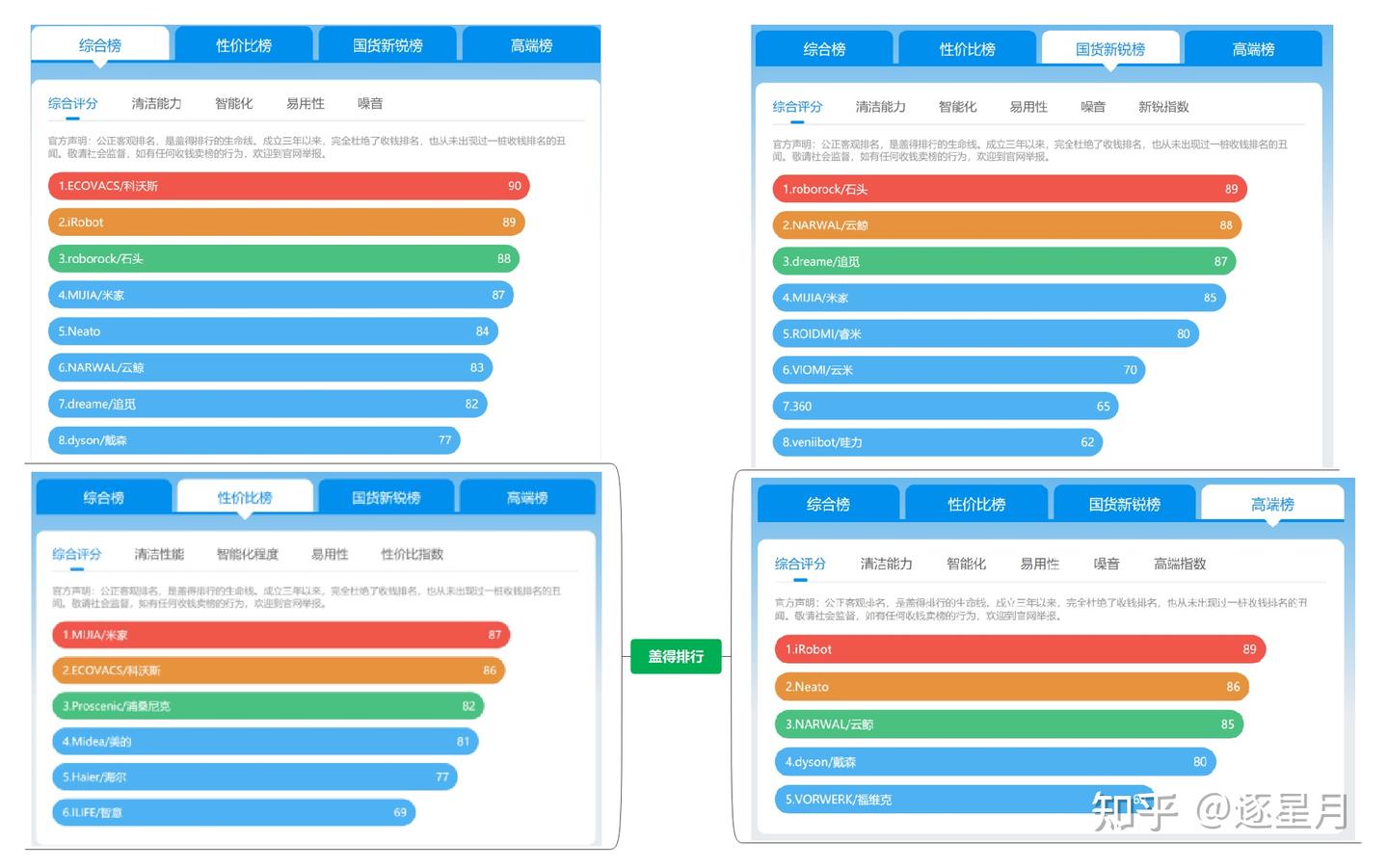 数据来源:盖得排行过去大受欢迎的iRobot,现在受欢迎程度降低了。科沃斯在综合评分上排名第一,他家的扫地机器人在市场上市占率很高。国货新锐榜有石头、云鲸、追觅品牌比较突出。