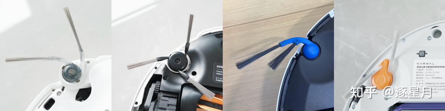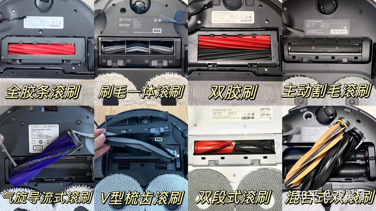 ①全胶条滚刷:有助于刮掉地面顽固颗粒,方便清理毛发。②刷毛一体滚刷:有助于拔出地砖、地板缝隙的灰尘、花生皮、瓜子壳。这个材质适合大部分家庭。③双胶刷:两个全胶条滚刷的结合和单个全胶条滚刷相比之下,防缠绕能力更好。两个全胶条滚刷中间基本没有缠绕,但由于滚刷两端大小一致,毛发会缠绕在滚刷两侧。④主动割毛滚刷:能边扫边切割毛发,从根源解决长发缠绕问题,防缠绕能力最佳,在清洁滚刷上很省事。⑤气旋导流式滚刷:在刷毛一体滚刷基础上设计成粗细不一的造型,再通过气旋导流吸走毛发,防缠绕效果也还可以,缠毛量很少。⑥V型梳齿滚刷:V型设计的螺旋滚刷加上双梳齿的错位结构设计以及大吸力的作用,毛发防缠绕效果表现不错,遇到大量毛发时中间部分会有少量缠绕。⑦双段式滚刷:两侧滚刷通过旋转剥离毛发,在吸力和窄尘口的作用下,吸入毛发。防缠效果比双滚刷好,但中间部分也会出现缠绕情况。⑧混合式双滚刷:胶刷+胶毛一体组合,胶刷深层清洁地毯,毛胶一体刷深入缝隙清洁。外形上是锥形防缠绕设计,当长发或者宠物短发缠绕在滚刷上时,可以轻松甩下并吸入,两端也不会缠绕毛发,防缠效果表现不错。【📢注:混合式双滚刷、主动割毛滚刷代表机型是追觅品牌;V型梳齿滚刷代表机型是科沃斯品牌;全胶条滚刷、双胶刷、双段式滚刷的代表机型是石头品牌;气旋导流式滚刷和吸口式代表机型是云鲸品牌。刷毛一体滚刷是大部分机型的主要采用方式。】