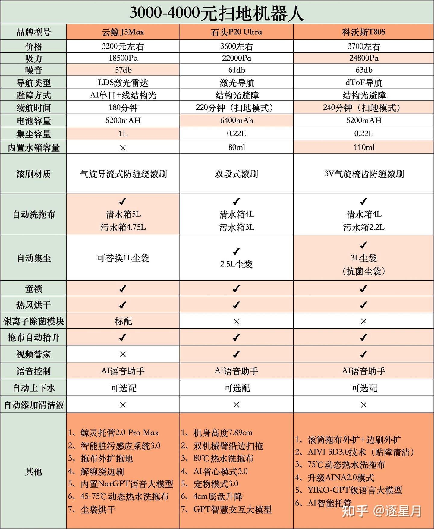 石头P20 Ultra的吸力提升到了22000Pa,可以更好处理缝隙灰尘。机身高度降低为7.98CM,可进入更多低矮空间清洁,更适合家里低矮区域多的家庭。滚刷升级为双段式滚刷,通过卷、聚、剥、吸,改善了上一代容易缠绕毛发的情况。整体洁地面毛发效率表现不错,毛发缠绕情况更少,但实测发现滚刷起始端依旧会存在一些缠绕情况,不太适合长发较多的家庭使用。越障高度最高能越4cm,能越障一定高度的门槛高度,提高了扫拖清洁覆盖率。全新升级高温基站自清洁2.0,配备80℃高温热水洗拖布功能、清洁盘可整体拆卸、新增污水箱除臭模块,拖布清洗干净卫生。新增GPT智慧交互大模型,语音操控更加智能方便。另外,内置了AI省心模式3.0,多了可设置在勿扰时段内,主动降低吸力,减少噪音。石头 P20 Ultra 机身薄,只有7.89cm,更适合家里低矮区域多的家庭入手。https://xg.zhihu.com/plugin/2e63b1efe8a0913810d4a2b32f32889e?BIZ=ECOMMERCE(3)科沃斯T80S【3700元左右】科沃斯T80S和以往扫地机拖布不同,采用的是滚筒活水洗地。