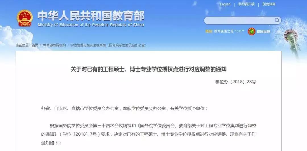2018年中旬,国务院学位委员会办公室发布了一则公告:《关于对已有的工程硕士、博士专业学位授权点进行对应调整的通知》。
