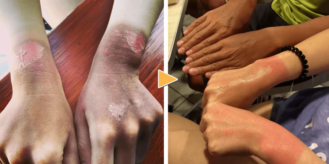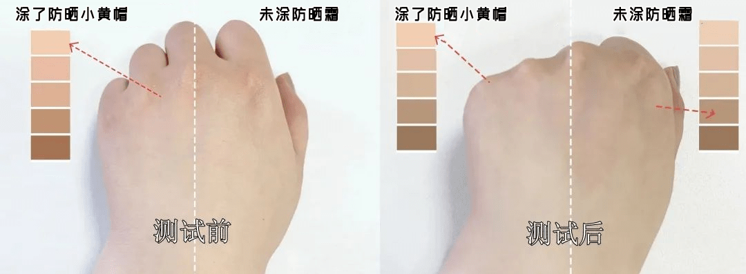 在经过半小时的模拟“晒黑下”,没有涂防晒的一边已经被晒黑了将近3个色号!而涂了小黄帽的一边几乎没有被晒黑~