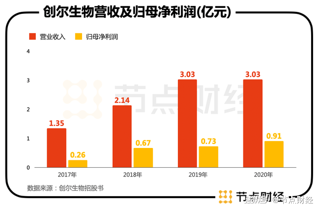 2017-2020年,创尔生物实现营业收入分别为1.35亿元、2.14亿元、3.03亿元和3.03亿元;实现归母净利润分别为0.26亿元、0.67亿元、0.73亿和0.91亿元。