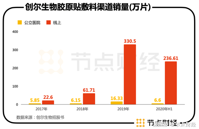 创尔生物的生物护肤品销售模式主要分为经销模式、直销模式和产品终端销售三种。其中,最主要的模式为直销。在直销方面,创尔生物线下直销模式下销售的胶原贴敷料,主要销往公立医院及药房。2017-2020年H1,销往公立医院的数量分别为5.85万片、6.15万片、16.33万片及 6.60万片;线上方面,2017-2020年H1,创尔生物的胶原贴敷料销量分别为22.6万片、61.71万片、330.5万片、236.61万片。