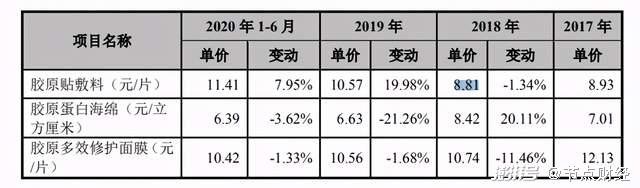 当前,创尔生物的毛利率维持水平较高,其中一个原因与价格相关。2017-2020年H1,创尔生物的胶原贴辅料已经连续数年涨价,单片价格由最初的8.93元一片,升至11.41元一片。