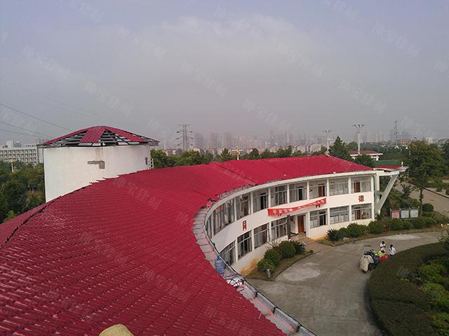 3.不适合坡度小于15度的屋面,合成树脂瓦是仿古琉璃瓦型的,这个瓦型设计倾向于美观仿古,扁平弧线形的波峰有2.5cm左右的波高满足不了大跨度建筑屋面的流水需要,所以建议大跨度、平坡度的建筑屋面慎用合成树脂瓦作为主要屋面材料,当然可以配合些高波形的T型瓦加以搭配使用。