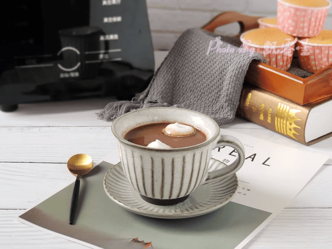 2.放入1大匙可可粉、1大匙红糖,加入250ml开水