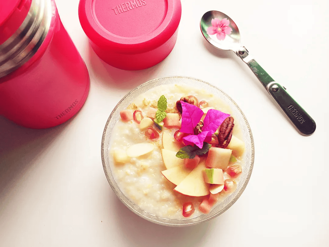 6.焖好后打开盖子,加入水果丁和热椰汁、亚麻籽粉即成。