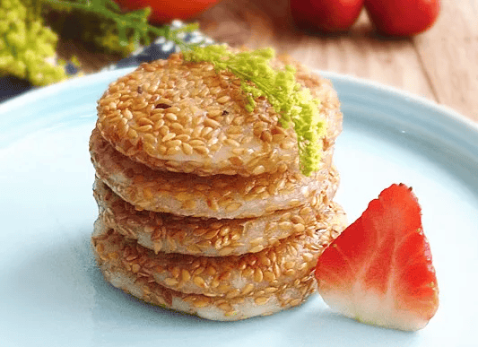 5.糯米粉团包好红薯泥后压扁,沾上黄金亚麻子