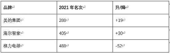 8月2日,《财富》2021世界500强榜单发布,三大家电巨头均榜上有名。其中,美的集团位列288名,较去年上涨19位;海尔智家排名405位,较去年上涨30位;格力电器排名488名,较去年下滑52位。