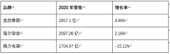 其次,从营收来看,格力电器增长乏力,海尔智家增长最好,美的集团营收最高。2020年年报显示,格力电器总营收1704.97亿元,同比增长-15.12%。海尔智家2097.26亿元,同比增长4.46%。美的集团为2857.1亿元,同比增长2.16%。
