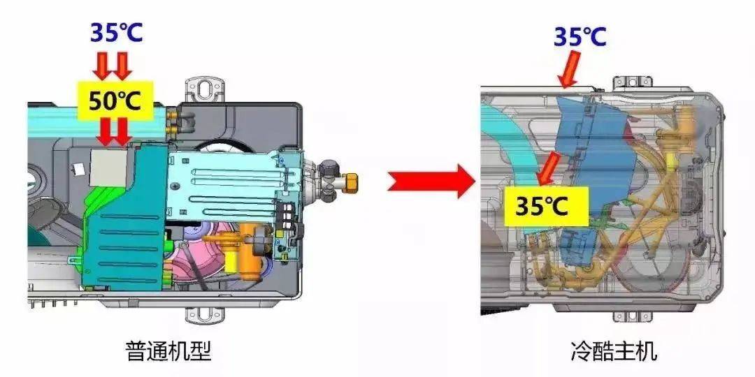 相同换热面积下,C型APF(全年能源消耗效率)实测比L型高出6.5%,换热更加均匀,换热效率更高!(普通外机,L型换热器;冷酷外机,C型换热器)