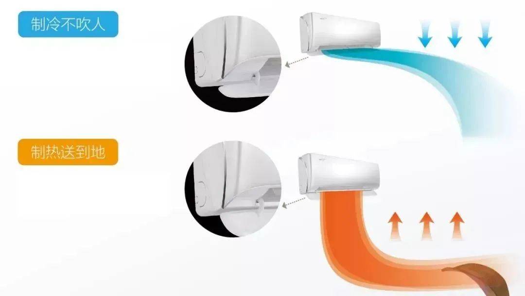 制冷时,控制冷风水平向上吹出,不直吹人,更舒适;制热时,双导风板实现压风,控制暖风向下吹出,直达地面,让室内温度更均匀。