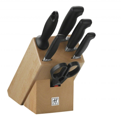 如果你想要一劳永逸不想挑来挑去,建议购买FOUR STAR® & FOUR STAR II,他们是双立人最畅销的刀具系列之一。双立人的四星系列刀具最早出现在1976年,具有里程碑意义。这一套四星木制插刀架套装包括水果刀、三明治刀、厨房叉、面包刀、砍刀、西厨刀、切片刀、去骨刀、磨刀棒及黑色厨房多用剪榉木插等随机组合。