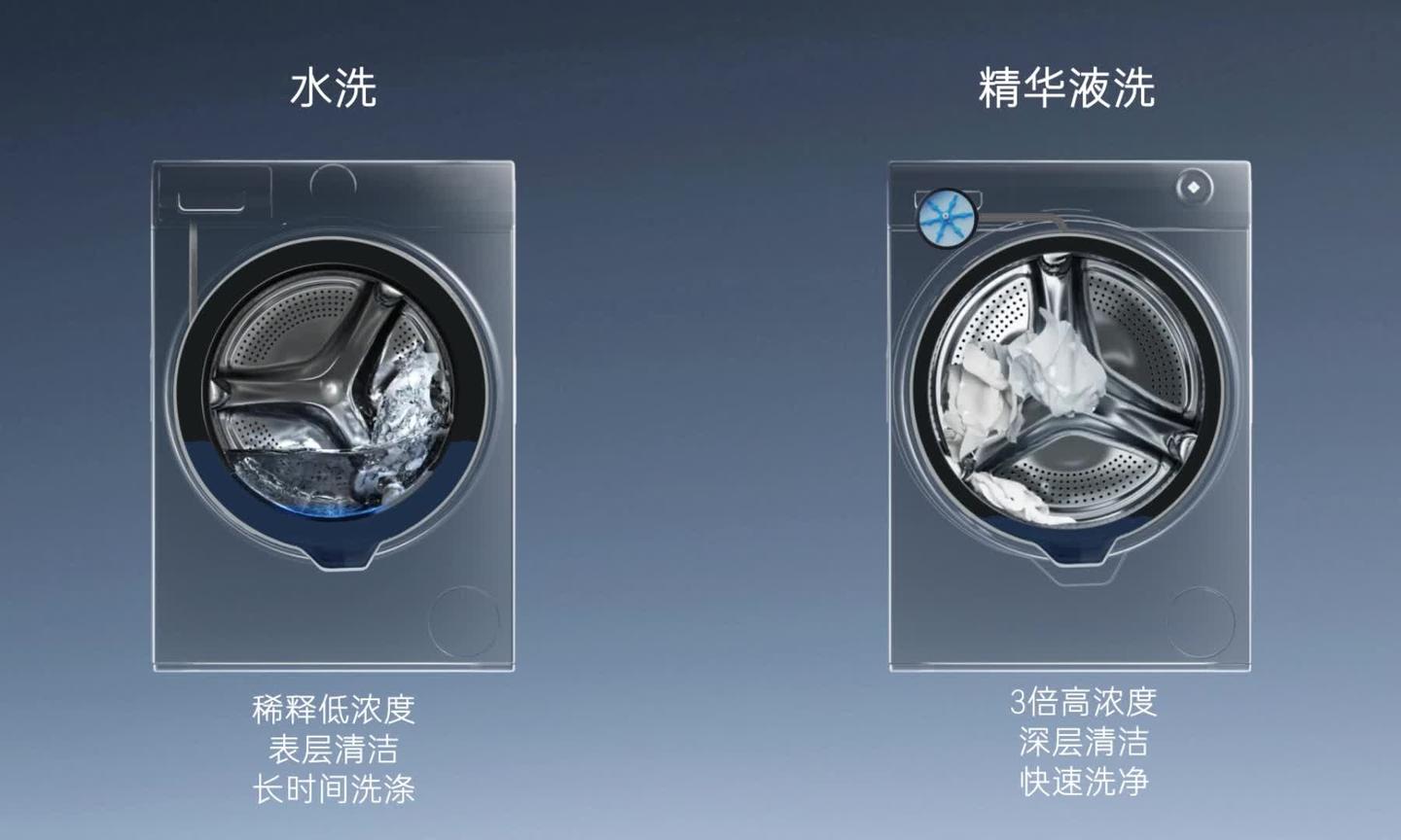 具体来说,它是通过超净精华洗+涟漪柔净内筒来实现高洗净比的。在洗衣前,它会先通过速溶预混舱生成3倍浓缩的精华液,再利用高压双向喷淋配合内筒的转动,确保精华可以深入衣物纤维,达到深层清洁的效果。这样即使是顽固污渍也都能被彻底清除。