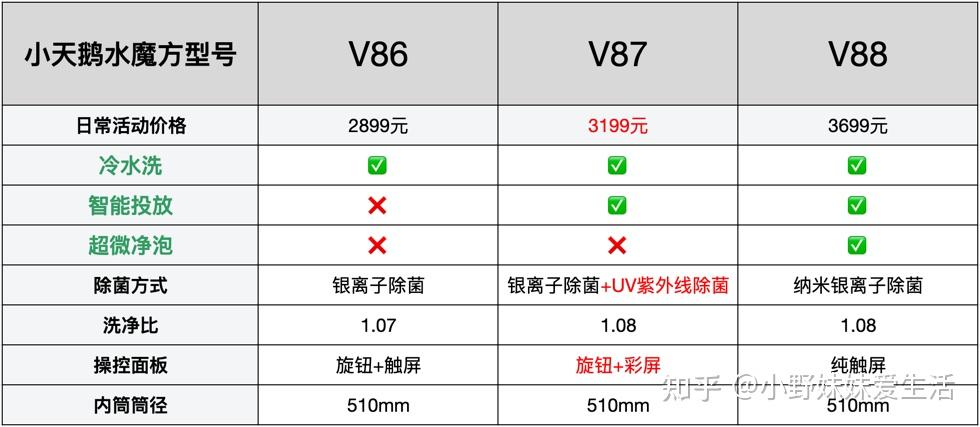 注意:买这款的朋友如果是嵌入洗衣柜,需要注意这款机型的宽度是600mm,而非正常的595mm。剩余的两款就是小天鹅的V86和V87了,其实上面我们在说到单洗机型的时候也已经说过了:
