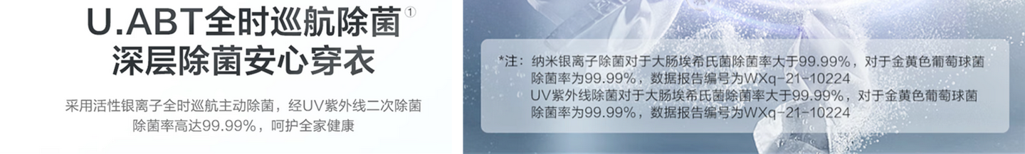 FPA直驱电机(USP不间断速洗、摇篮柔洗)+双智能投放(洗衣液+柔顺剂)+525mm大筒径+UVC紫外线除菌;