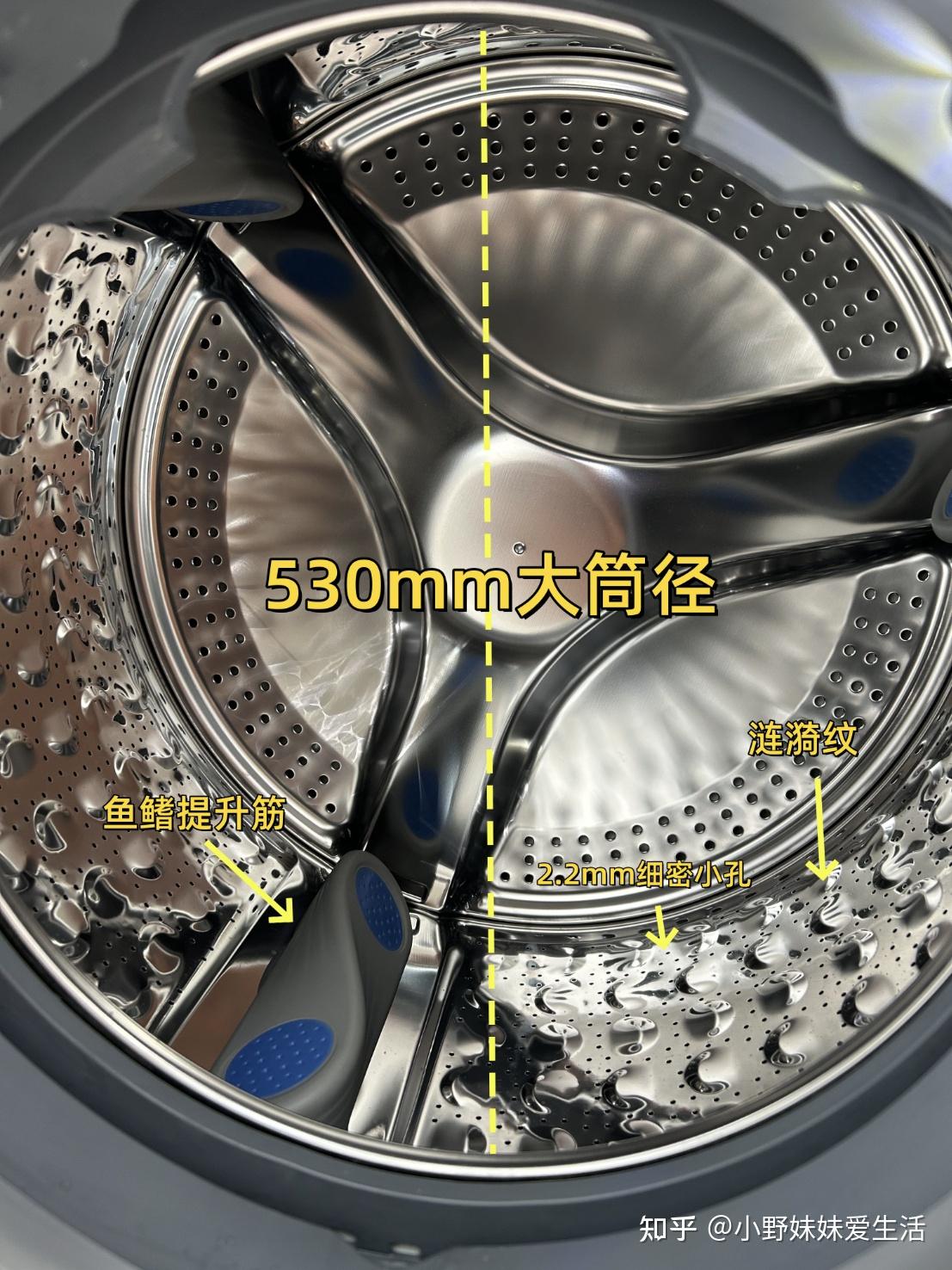 再说说它的“涟漪柔净内筒”。可以看到,洗衣机内筒表面设计成了水波涟漪纹的样子,洗衣时能制造出细密的小水流,就像是给你的衣服做了一场轻柔的按摩。特别的是,内筒上有2.2mm的细密孔径,既能让水流强力去污,又不会对衣物造成伤害,尤其是真丝这类娇贵面料,完全不用担心勾丝或损伤的问题。