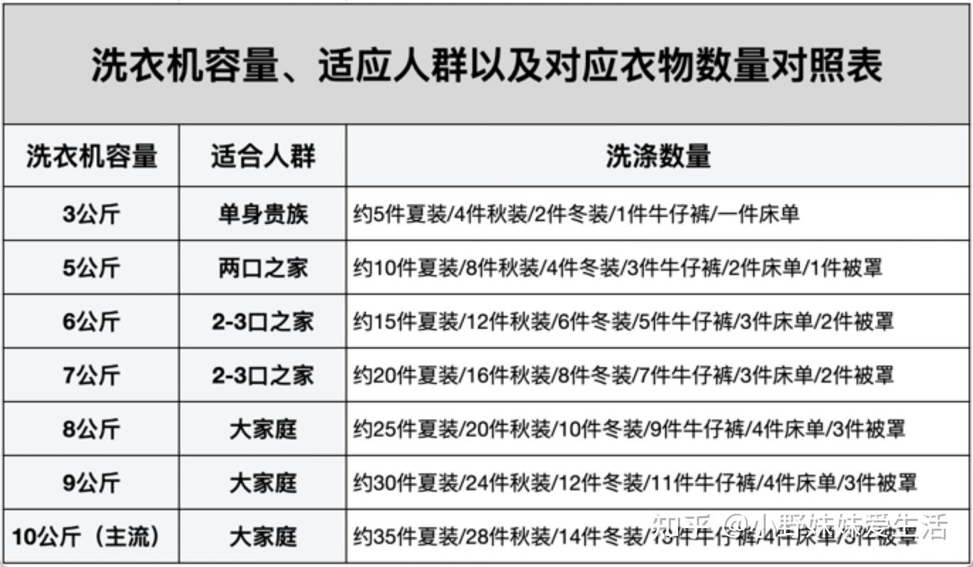 1.2、容量选择 & 洗衣机尺寸(以及放哪里、怎么放)容量和洗衣机的尺寸是相关联的,一般容量越大,体积也会越大。容量选多大?洗衣机上面一般会贴有「8KG」、「10KG」等字样,这就是洗衣机的公斤数,那么对于不同家庭和用户而言该选多大的容量的洗衣机呢?