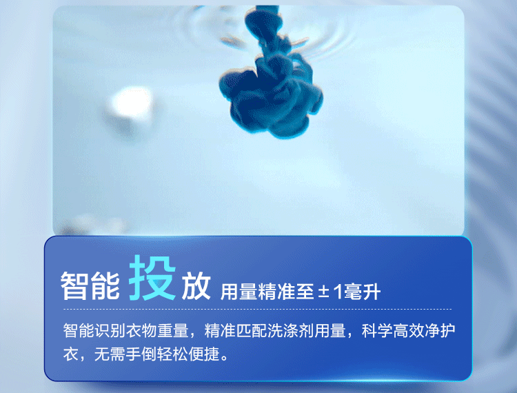 抗菌的「喷淋技术」和「抗菌材料」因其成本不高,某些大品牌基本都是标配。 除菌的「高温除菌」(加热到90度以上)、「巴氏除菌」(加热到60度)除菌基本上在低端机型中出现;「银离子除菌」、「臭氧除菌」、「紫外线除菌」等技术会在中端机型中采用。3.4、智能投放解放双手利器:关于智能投放功能是很多朋友都很喜欢的,因为可以真真正正的解放双手,我们只需要一次性往自动投放盒里倒进洗衣液,其他的我们都不用管了,至于每次洗衣服的时候需要倒多少,这个洗衣机自动帮我们决定。