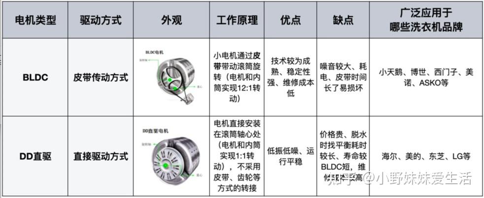 ps:当你真的不知道如何选择品牌的时候,你可以选择口碑比较好、市场占有率比较高的品牌,大概率不会错。三、洗衣机选购要点除了以上几点我们需要考虑以外,我们还需考虑以下几点选购因素:3.1、电机类型选择(BLDC电机 or DD直驱电机)电机是一台洗衣机的「心脏」,尤为关键,滚筒洗衣机现在普遍存在的电机类型有两种:BLDC无刷电机:英文全拼(Brushless Direct Current Motor),BL就是Brushless,意为「无刷」;DC就是Direct Current Motor,意为「直流电机」;全部拼起来就是「无刷直流电机」。DD直驱电机:英文全拼(Direct Driver),电机直接驱动滚筒。直驱电机是一种驱动的方式,而BLDC是一种电机类型,理论上来说,两者其实是不能相提并论的。 任何一种电机如果采用的是直驱方式,那么它就能被称作DD直驱。