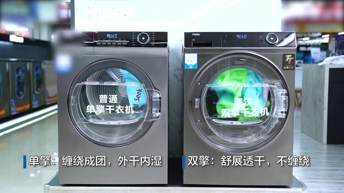 海尔双擎热泵技术由于是搭载了双独立电机,分别单独控制烘干转筒以及风扇出风,所以从设计上就能解决单旋转带来的问题: