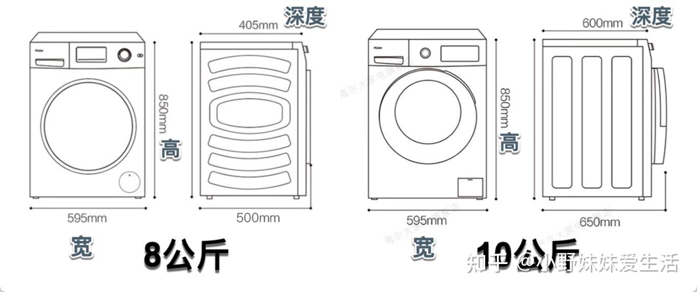 宽:595mm;高:850mm;而深度则与容量大小有关,容量越大深度也就越大。 如上图所示,8公斤容量的深度为405mm,而10公斤容量的深度为600mm。这也成了行业内不成文的规定了,不然对于家装来说真的是很麻烦。