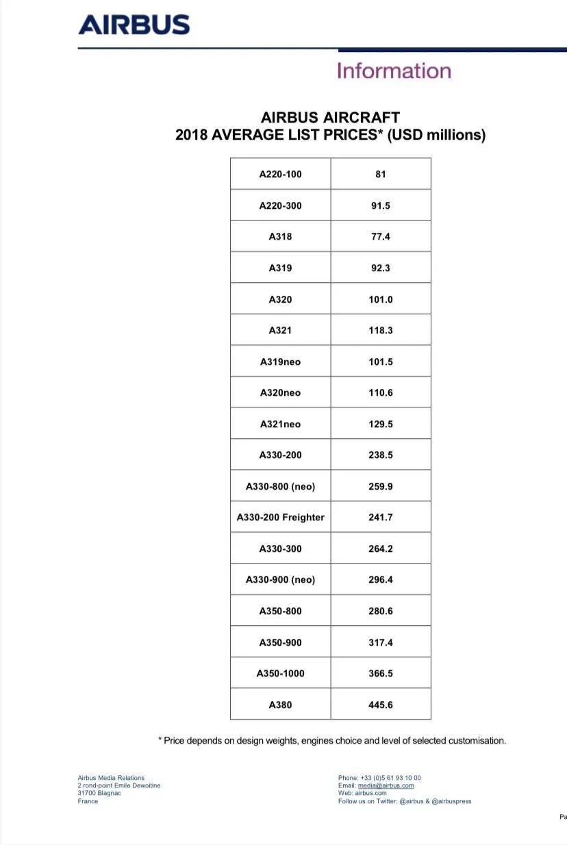 空客飞机价格范围为8100万美元到4.45亿美元。