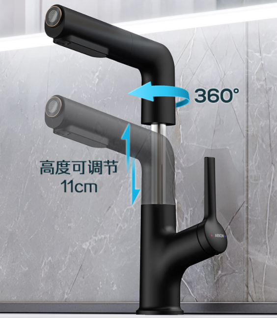 有黑色和亮色两款颜色,可以和家里的花洒颜色进行搭配。龙头可抽拉,可自由旋转90°非常方便,洗衣服洗头都可以旋转过去避开龙头。亮点是配有上出水,漱口模式很少见,非常不错。