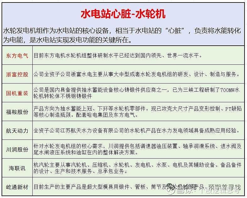 水轮机在水电站中起着核心作用,是将水能转化为机械能的关键设备.其通过带动发电机旋转进而产生电能,水流通过水轮机时,其动能和势能推动转轮旋转,将水的能量转化为转轮的机械能。例如三峡水电站的混流式水轮机转轮直径达10米,每秒可处理10万立方米的水流,能有效将水的能量转化为机械能。水轮机转轮通过主轴连接发电机,发电机的定子绕组切割转子磁场产生电流,这一过程遵循电磁感应定律?,从而将机械能转化为电能。雅鲁藏布江下游水电工程主要采取截弯取直、隧洞引水的开发方式,规划建设5座梯级电站,规划装机容量6000万-8100万千瓦,对水轮发电机组需求巨大。水轮发电机组作为水电站的核心设备,相当于水电站的“心脏”,负责将水能转化为电能,是水电站实现发电功能的关键所在。而雅下水电站其2000米天然落差与超高压水头条件,对冲击式水轮机转轮的设计、材料、制造及运维提出了前所未有的挑战。常规水电项目水轮机及附属设备的单位价值量大约在0.74-1.33元/瓦,考虑到雅下建设难度大、高水头对轮机要求高,保守假设单瓦设备价值高于平均水平 20%.则水轮机及附属设备单位价值量约为 0.888-1.596元/瓦,据此保守测算水轮机及附属设备订单价值约535-954亿。若按照总投资1.2万亿来计算,参考相关推测中设备投资约 4000亿来算,水轮机及附属设备价值量占设备投资的比例约为13.38%-23.85%。盾构机需求测算:120亿水轮机需求测算:530-954亿相关小表哥奉上,供老师们参考: