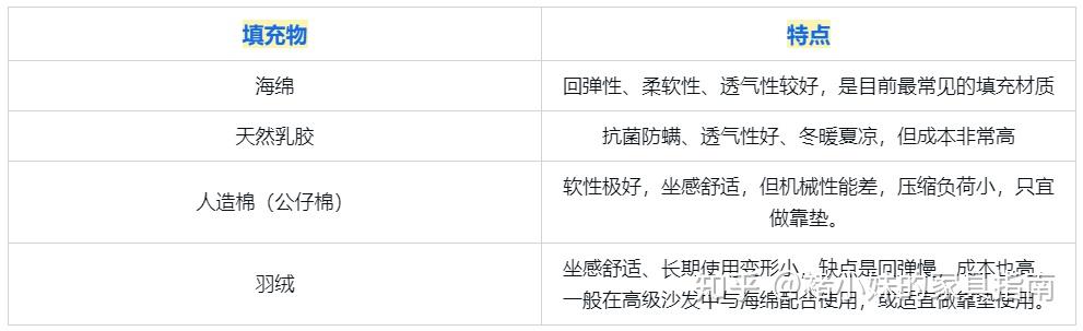 2、填充物材质填充物决定了沙发最终的软硬程度和舒适度,市面上可用作填充物的材料有:海绵、乳胶、人造棉和羽绒,