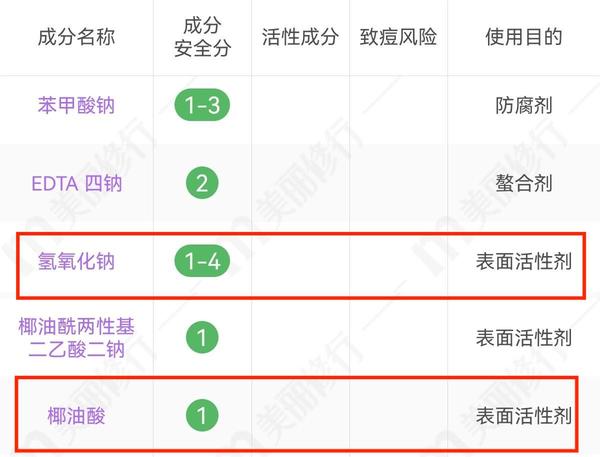 皂基类表活是最早被使用于清洁头发和皮肤的表面活性剂,在成分表中,典型公式是:脂肪酸+碱剂,以棕榈酸、肉豆蔻酸、椰油酸+氢氧化钠/氢氧化钾一起搭配出现。